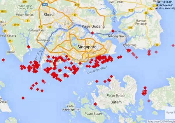 船运数据显示,约有50艘超级油轮停靠在新加坡附近,等待补给燃料、保养维修、卸货或者是纯粹被当做漂浮的储油基地。