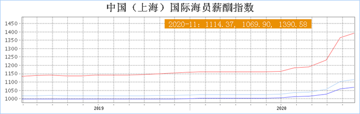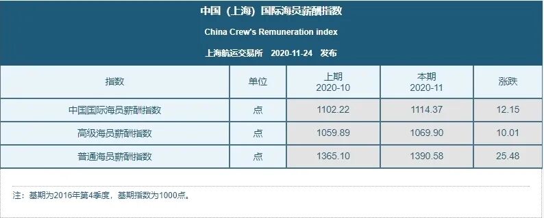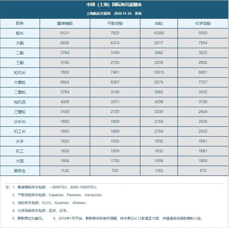 2020年11月24日,上海航运交易所发布的中国(上海)国际海员薪酬指数报收1114.37点,较上期上涨12.15点。本期高级海员薪酬指数报收1069.90点,较上期上涨10.01点;普通海员薪酬指数报收1390.58点,较上期上涨25.48点。9月份以来,国外疫情的二次爆发,中国船员市场延续整体供不应求的趋势。近来发生几起菲律宾籍船员核酸检测阳性的事件,增加了国际船员市场对雇佣外籍船员的担忧。诸多因素导致国内船员薪酬继续上涨。分职位看:本月除了不同船型的服务生工资各有涨跌之外,其他职位均有不同幅度的增长。本月二副及二管轮薪酬涨幅最为明显,尤其是干散货船的二副及二管轮工资上涨均超过150美元。三副及三管轮最近几月也是供不应求,薪酬不断上涨还是难以满足船员市场的需求。本月集装箱船海员薪酬除了大副及服务生工资保持不变,其他职位薪酬均有上涨。上涨最为明显的是二管轮及二副,分别达到95、96美元。三副及三管轮薪酬涨幅也超过了50美元。本月干散货船海员薪酬除了服务生薪酬下跌42美元,其他职位均有上涨。上涨最为明显的二副及二管轮涨幅分别达到158、165美元。三副及三管轮薪酬涨幅也达到137美元。本月油轮海员薪酬均有上涨,且上涨幅度均超过20美元。上涨最为明显的二副及二管轮涨幅分别达到58、59美元。电机员薪酬涨幅相对也更明显,达到59美元。本月化学品船海员薪酬均有上涨,其中服务生涨幅最低达到10美元,而电机员涨幅最高达到66美元。