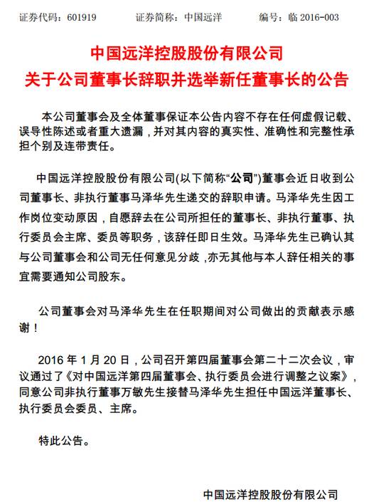 1月20日晚间,中国远洋公告称,马泽华先生因工作岗位变动原因,自愿辞去在中国远洋(601919)所担任的董事长、非执行董事、执行委员会主席、委员等职务。公司召开第四届董事会第二十二次会议,同意公司非执行董事万敏先生接替马泽华先生担任中国远洋董事长、执行委员会委员、主席。